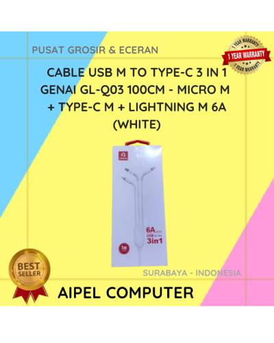 GLQ031 | Cable USB M To Type-C 3 IN 1 GENAI GL-Q03 100CM – Micro M + Type-C M + Lightning M 6A (White)